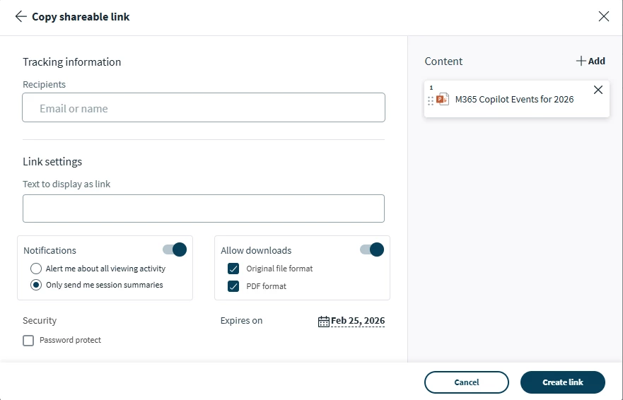 I’m using the Workspace feature in Seismic to create content (PowerPoint slides) to share with my customers. I typically upload the content and then Create a Link in Seismic and send that link out via email.